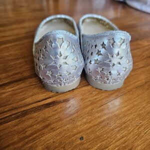 The Jimmy Choo Metallic Silver Leather Flats with Star Laser Cutouts in EU size 37.5 are a stylish and versatile choice for any occasion. Featuring a sleek design with a narrow toe and squared off tip, these slip-on flats are made of high-quality leather with a breathable and lightweight outsole. The silver color and laser-cut star accents add a touch of glamour, making them perfect for events like weddings, parties, or formal gatherings. Designed in Italy, these flats are both fashionable and comfortable, with a durable rubber outsole for added protection. Excellent Pre-owned condition.