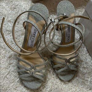 Step out in style with these stunning Jimmy Choo silver glitter heels. Perfect for any occasion, these shoes add a touch of glamour to your outfit.