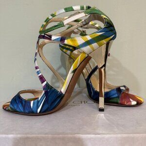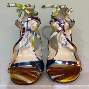 The Jimmy Choo Multicolor Lang Strappy Heels in size 37 are a stylish and fashionable choice for women. These high heel stiletto shoes feature a peep toe design with a buckle closure for a secure fit. The multicolor leather upper material adds a trendy touch, while the adjustable ankle strap provides added comfort and convenience. Perfect for adding a touch of glam to any outfit, these Jimmy Choo heels are a must-have for any fashion-forward woman looking to make a statement.