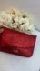 Elegant red crossbody bag with shimmering finish. Features a stylish gold chain. Ideal for evening outings.
