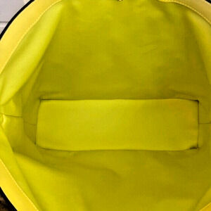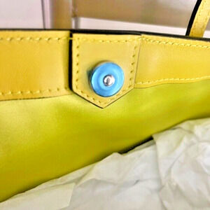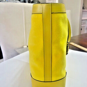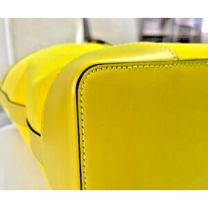 This is a stylish Jimmy Choo Malibu Toweling East-West tote bag in a large size, featuring a tropical pattern and a vibrant yellow exterior, handle/strap, and lining. Made of leather, malibu toweling, and suede, with the brand's logo. This Jimmy Choo tote is part of the Nine2Five collection and is being sold brand new with tags for $1095.