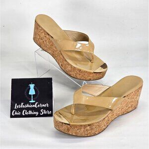 Jimmy Choo Nude Patent Leather Pathos Thong Cork Wedge Sandals Sz 39.5 (9) 024
