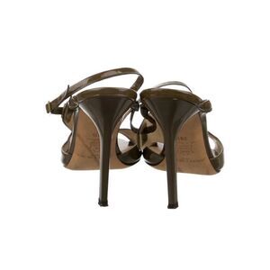 Elegant olive green patent leather heels. Features a stylish buckle detail. Perfect for any occasion.