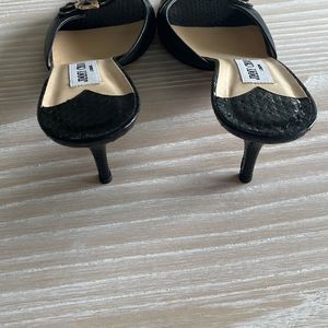 Jimmy Choo featuring buckle detail at the toe, open toe, slip-on style and mid heel.