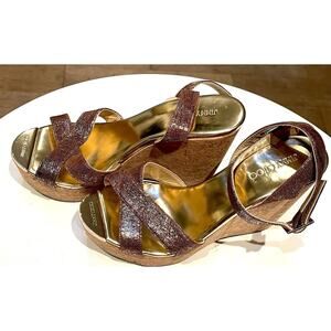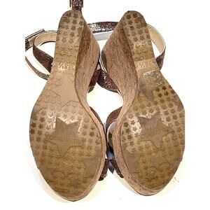 Jimmy Choo Papyrus Gold Copper Shimmer Leather Cork Wedge Sandals Ankle 38.5