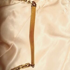 Jimmy Choo Patent Clutch, tan bag, chain on each side. inside zipper, snapped button. leather. made in italy.