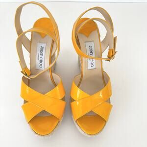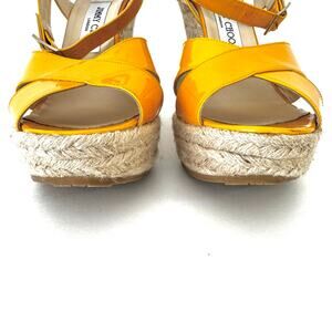 Jimmy Choo Patent Leather Espadrille Wedge Heels Sandals Yellow 40 US 10