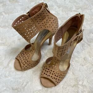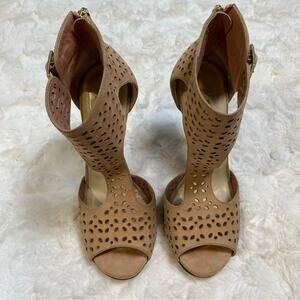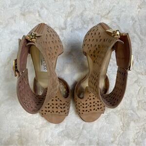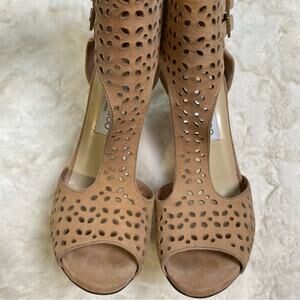Jimmy Choo Peach Pink Laser Cut Suede Peep Toe Heeled Sandals Women’s Size 36.5