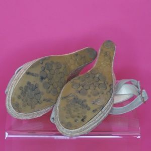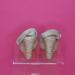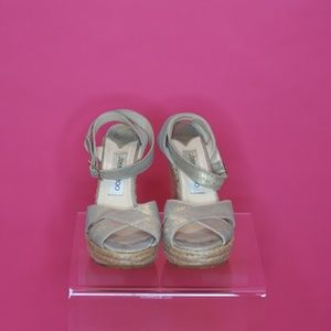 Pre-owned Jimmy Choo Phoenix Gold Platform Wedge size 38. In good condition ➡️ FLAWS - see photos for marks, discolorations to espadrille parts and tiny mark on top of one sandal ⬅️ 👉 PRICED FOR FLAWS 👈