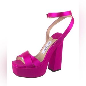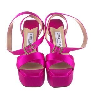 These eye-catching pink heels from Jimmy Choo boast a substantial platform and a thick block heel, ensuring both style and stability. The smooth upper material and open toe design are complemented by a single ankle strap with a buckle closure, making them a bold statement piece.