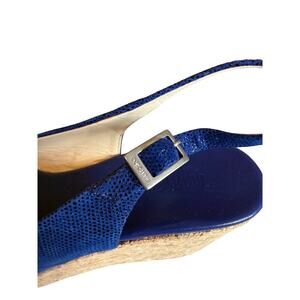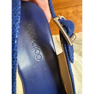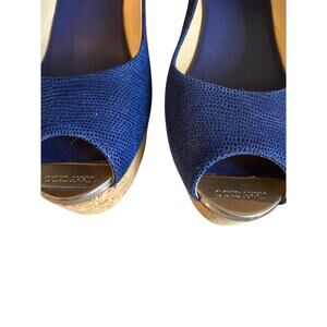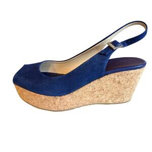 Jimmy Choo Platform Slingback Wedge Cork Peep Toe Sandals Blue 8.5. Excellent preowned condition, like new. Features adjustable back, non slip soles, logo at toes.