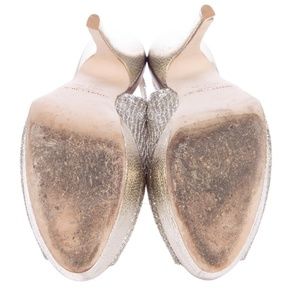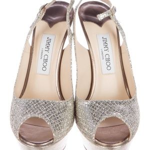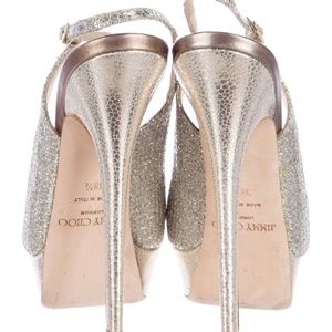 Metallic silver and gold Jimmy lamé Jimmy Choo slingback pumps with peep toes, covered heels and buckle closures at ankles. Designer runs size small.