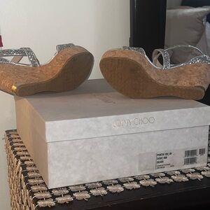 Shimmering silver straps. Cork platform base. Elegant and chic design. Worn only once for photo shoot. Original box and dust bag included.