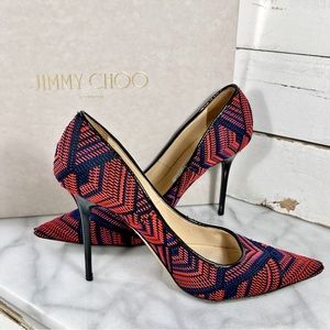 Jimmy Choo Red & Navy Geometric Pattern Woven Pointed Toe Heels