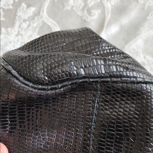 Authentic Jimmy Choo Riki bag in printed patent and suede. Two handle tote style bag in excellent condition. The bag is slightly worn on corners and clasp is scratched (pictured). 11 inches across and 10 inches high.