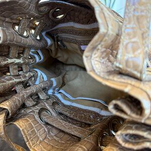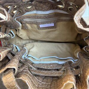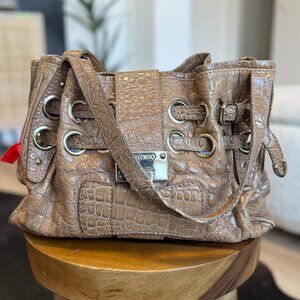 Patterned leather shoulder bag with dual handles for easy carrying, and crafted with multiple pockets. Features silver hardware with classic Jimmy Choo logo at closure.