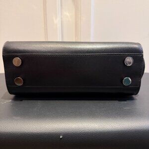 This bag is in superb condition. There are slight marks of use on the front and back leather that are barely noticeable. The latch has slight use as per the picture. Inside is very clean with a very small dark spot on bottom and on side pocket. Straps and handles are in mint condition.