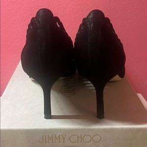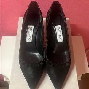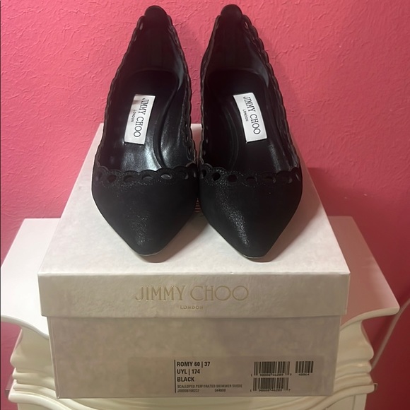 Comes with box! Jimmy Choo Romy Black 60 mm/2.4 inches. Size EU 37 (US 7). “Scalloped Perforated Shimmer Suede.” Great pre owned condition!! Very well taken care of.