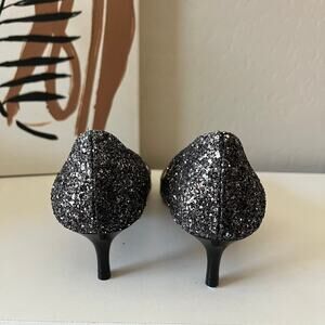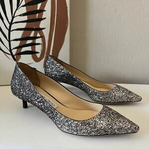 Jimmy Choo never fails. Make a statement flaunting the Romy heels. Crafted in a sparkly ombre glitter. Made in Italy. Pointed toe. Kitten heel. Size 37, may fit a U.S. 7.