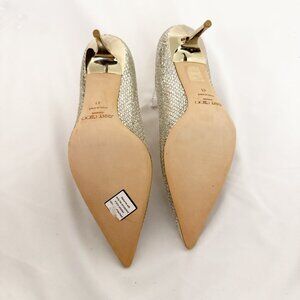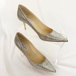 These Jimmy Choo Romy silver glitter heels in size EU 41 (US 10) are perfect for the upcoming holiday/party season. These stylish pumps feature a pointed toe, 2.5" heel height which makes it just 1/2 an inch taller than a kitten heel, which making them perfect for standing on your feet for evening parties, black tie, or cocktail events. Made in Italy with high-quality leather and lining materials, these heels are a luxurious addition to any woman's shoe collection. They are NEW WITH TAGS and are in beautiful condition. The exterior is described as a coarse silver glitter but it almost looks like snake skin - they are unique and fabulous!. Glamorous with a metal heel, they are also sometimes called Platinum Ice. I paid $850 for these shoes
