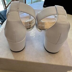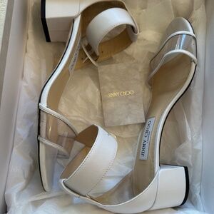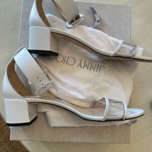Authentic white leather Jimmy Choo London Ankle Sandals. You can wear the white ankle buckle in the front or on the side. Includes original box and dust bags. Size 38.