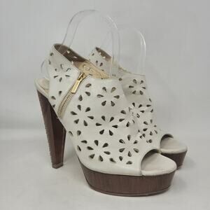 Upper features white leather with floral-inspired cutout design, peep toe, and gold-tone side zippers with Jimmy Choo branding