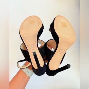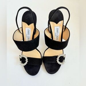 Jimmy Choo Saphie 120mm Crystal Charm Black Suede Platform Heels: These heels feature black suede, crystal charm embellishments, a platform, and a 120mm (4.7") heel. They are slingback heels.