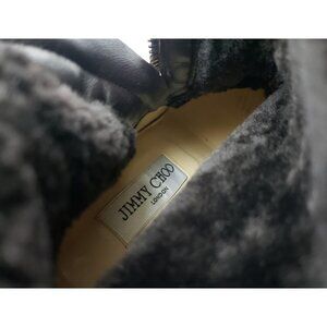Step out in luxe style with these stunning Jimmy Choo black leather ankle boots, crafted in Italy and lined with plush shearling for added warmth. Featuring a high stiletto heel, platform sole, and durable rubber tread outsole, they combine fashion with function for the colder months.