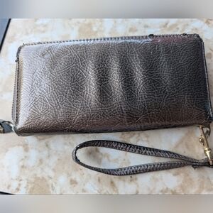 Elegant Jimmy Choo wallet with a shimmering bronze finish. Includes a convenient wrist strap.