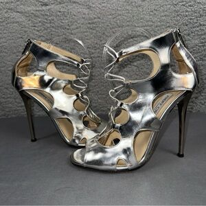 Jimmy Choo Shoes Womens 10 Silver Diffuse Mirror Leather Strappy Lace Up Heels