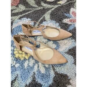 Jimmy Choo Vanessa Flat Pinkish Cream Suede Strap Lace Pointed Toe Ballet Flats 41 or US 10. Fair to good used condition. Soles show wear. By the tips of the toes & the back show wear. More so on your right foot. Color is light pink/ tan.