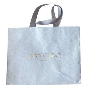 This Jimmy Choo shopping bag is an elegant accessory for carrying your purchases. Featuring the iconic brand logo, the bag is crafted with durable paper material, bottom insert and includes sturdy handles for easy transport. Its sophisticated design makes it a stylish choice for shopping trips or gifting purposes.