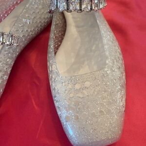 Chic silver flats with sparkling crystal strap. Perfect for adding elegance to any look.