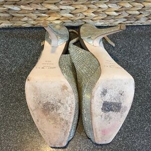 Elegant silver peep toe sling back “Nova” heels by Jimmy Choo. Bottom soles show some wear. Perfect for special occasions.