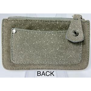 Authentic Jimmy Choo coin purse wallet in shimmering silver with signature star stud detailing. Crafted from perforated faux leather with glitter accents, this chic accessory features a zip-top closure, snap tab, and a detachable silver-tone carabiner clip for attaching to bags, belts, or keys. Compact yet stylish, perfect for holding coins, cash, cards, or small essentials on the go.