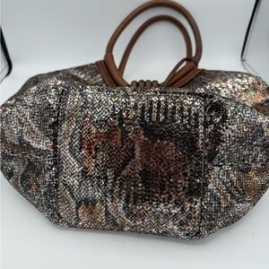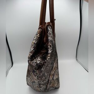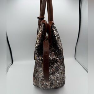 Chic shoulder bag with shimmering sequins designed to look like snake print. . Elegant design with leather accents. Minor callouts on interior strap that collapses the bag down: rubbing on the edges of this strap from going into the buckle. Otherwise minimal wear.