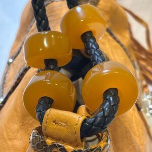 Features 2 braided long handles with brown beads and fringe detail