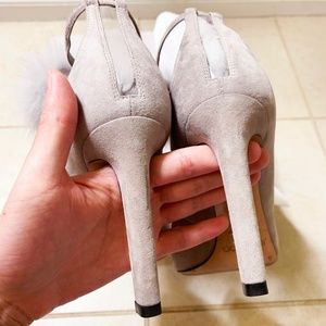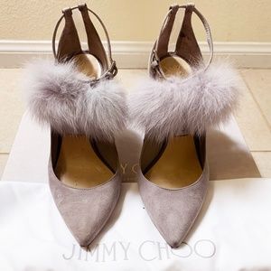 Jimmy Choo south 100 moonstone/white mix suede with fox fur pumps. Bought it at Neiman Marcus Las Vegas location in 2017 or 2018 (I can't remember exactly when). (The original price was $995 before sale tax). Gently used. No damage on heels. No dirt on the fox fur balls (the fur balls are removable). The original box and the dusty bag come. Thank you.