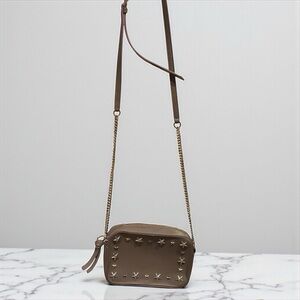 A chic and versatile Jimmy Choo crossbody in a neutral taupe shade with gold and silver-tone star studs. Features chain-and-leather strap detail, zip closure, and logo-stamped interior. Perfect size for daily wear or an evening out.