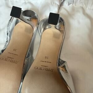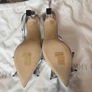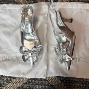 Jimmy Choo Staz 70MM Bow-Embellished Leather Slingback Pumps Silver Size 38