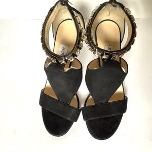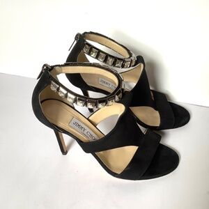 These Jimmy Choo sandals grab attention for their sophisticated glamour. Crafted from suede, they feature open toes, zippers on counters, and crystal embellishment on ankle wraps. Elevated on 10.5 cm heels, their insoles are lined with leather.