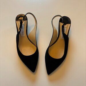 Embrace timeless elegance with these Jimmy Choo slingback heels. Designed with a pointed toe and a sleek silhouette, these shoes are crafted from luxurious suede and feature a comfortable block heel.