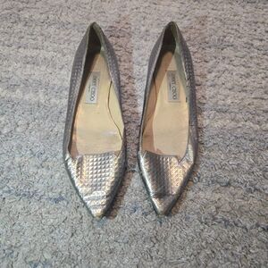 Jimmy Choo Sz 38.5 Metallic Silver Flats Pointed Toe. Sign of wear and visible scuffs. Please take good look at all of the pictures for the exact condition