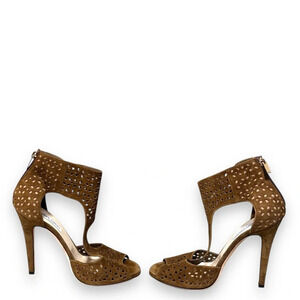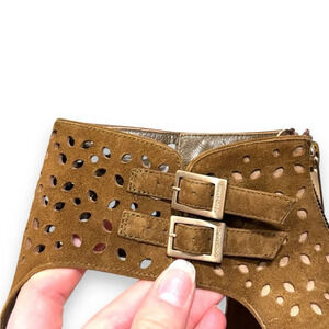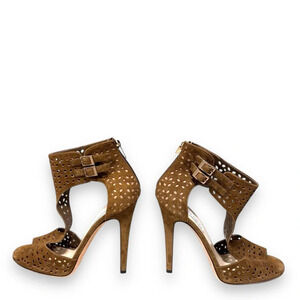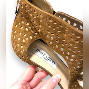 Step out in style with these elegant brown suede heels from Jimmy Choo. Featuring a chic cutout design, these shoes are perfect for any occasion. Beautiful Jimmy Choo "Tahi" sandals in brown suede leather with laser-cut perforated detail, two gold-tone ankle-strap buckles and a zipper at the back.