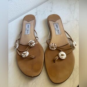 Step out in style with these elegant Jimmy Choo sandals. Featuring a chic tan color and unique shell accents, these shoes are perfect for any occasion. Elevate your wardrobe with this sophisticated design.