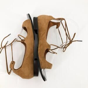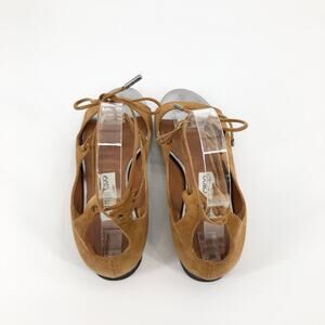 Elegant tan sandals with silver accents. Features lace-up design. Perfect for stylish outings.