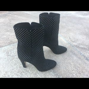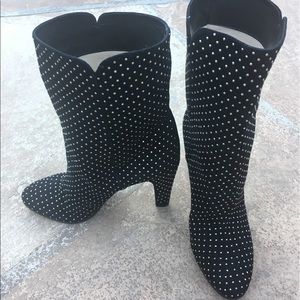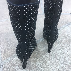 Authentic Jimmy Choo "Tari" Black Suede Mid Calf Boot covered with silver studs. Leather lining and sole and almond toe. This pull on boot is stunning. These are in gently used condition.