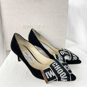 Stiletto heel, pointed toe, slip on, suede leather, logo bow detail, black. Cocktail, party, event, night out, semi formal, evening, work, designer, dressy, luxury.