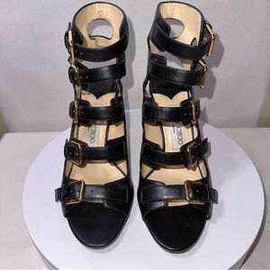Jimmy Choo Trick Buckle Gladiator Sandals Heels. Size 37. Black leather.