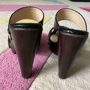 Jimmy Choo Ulrika wood slide sandals with black leather faux snakeskin upper. Great condition and very clean as shown. Size 36.